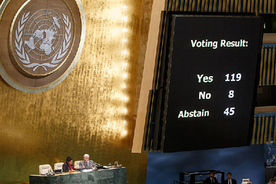 9月10日,在美国纽约联合国总部,大屏幕显示投票结果。(新华社记者李木子摄)