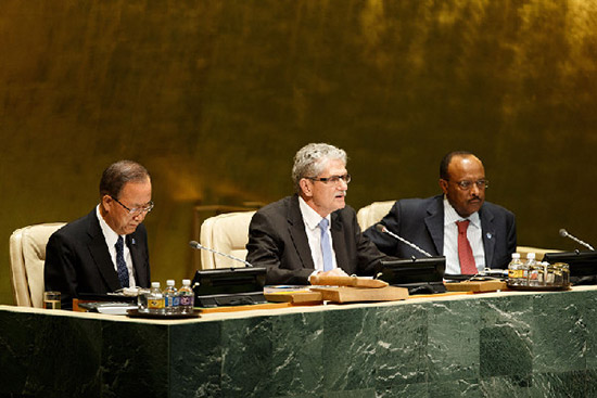 9月15日,在纽约联合国总部,第70届联合国大会主席莫恩斯·吕克托夫特(中)在第70届联大开幕式上讲话。(新华社记者李木子摄)
