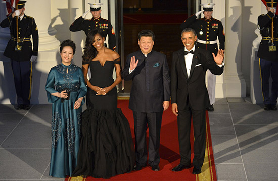 图:9月25日,中国国家主席习近平与夫人彭丽媛,和美国总统奥巴马及其夫人米歇尔一同出席华盛顿的白宫国宴/路透社