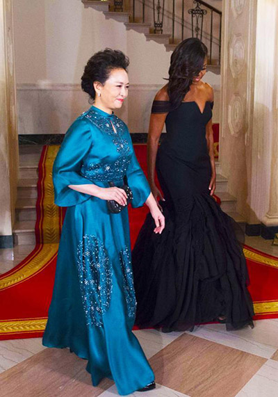 美国第一夫人米歇尔的服装由华裔美籍设计师王薇薇设计。王薇薇在Twitte上写道:“身为华裔美国人,能为第一夫人设计接待习近平主席与彭丽媛夫人的国宴造型,我深感荣幸。”