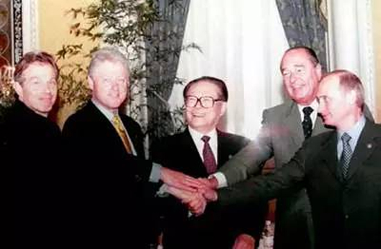 时任国家主席江泽民发表了讲话,峰会期间,他邀请了联合国安理会其他四个常任理事国的元首来到自己下榻的酒店,而当时的一张照片引起了人们的猜想。包括克林顿、普京、布莱尔和希拉克在内的五位元首,摆好姿势照了一张合影,江泽民正好位于四个人位置的中间。