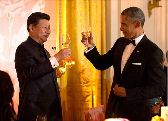 图:在举行中美元首峰会后,习近平在国宴时与奥巴马举杯致意/央视网