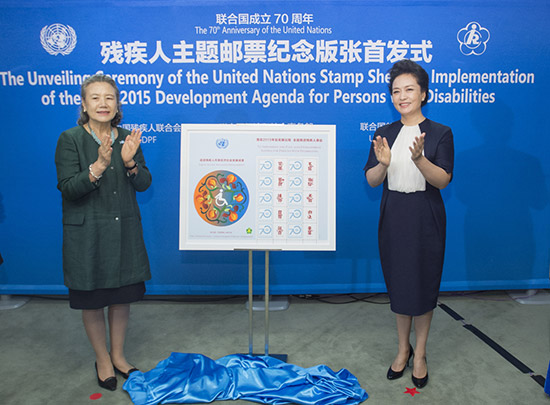 彭丽媛指出,在联合国成立70周年这一重要的时刻,中国和联合国共同发起以中国残疾人为主题的邮票纪念版张,反映了中国和联合国对残疾人事业的重视。