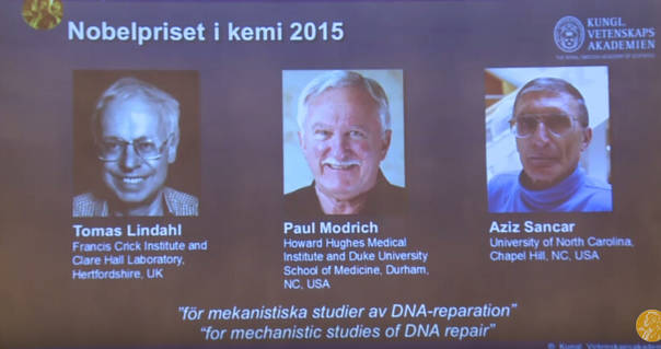 2015年度的诺贝尔化学奖今天揭晓。据诺贝尔奖官网,今年的诺贝尔化学奖授予瑞典科学家托马斯-林达尔(Tomas Lindahl),和美国科学家保罗-莫德里奇(Paul Modrich)和土耳其阿齐兹-桑贾尔( Aziz Sancar)等3人,因为他们在DNA修复的细胞机制方面的研究。
