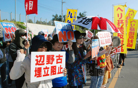 10月27日上午,市民团体在位于冲绳县名护市的美军施瓦布军营前抗议边野古搬迁方案