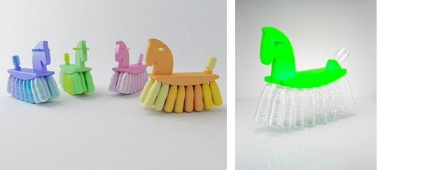 “神马”是由收集回来的废弃饮料瓶改造而成的摇摇木马,利用密集平均受力的原理,巧妙地将塑料瓶结合在木马上,重新赋予它们新的生命。