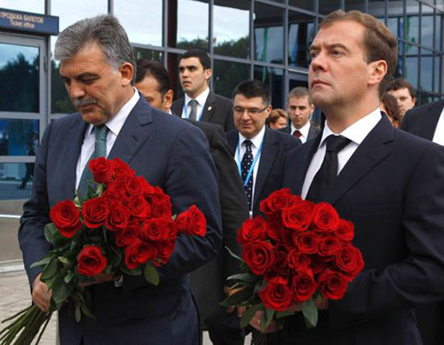 资料图:2011年9月8日早晨,俄罗斯总统梅德韦杰夫抵达位于雅罗斯拉夫尔附近的雅克-42客机失事现场,对事故现场进行了视察,并为事故遇难者献花进行哀悼。
