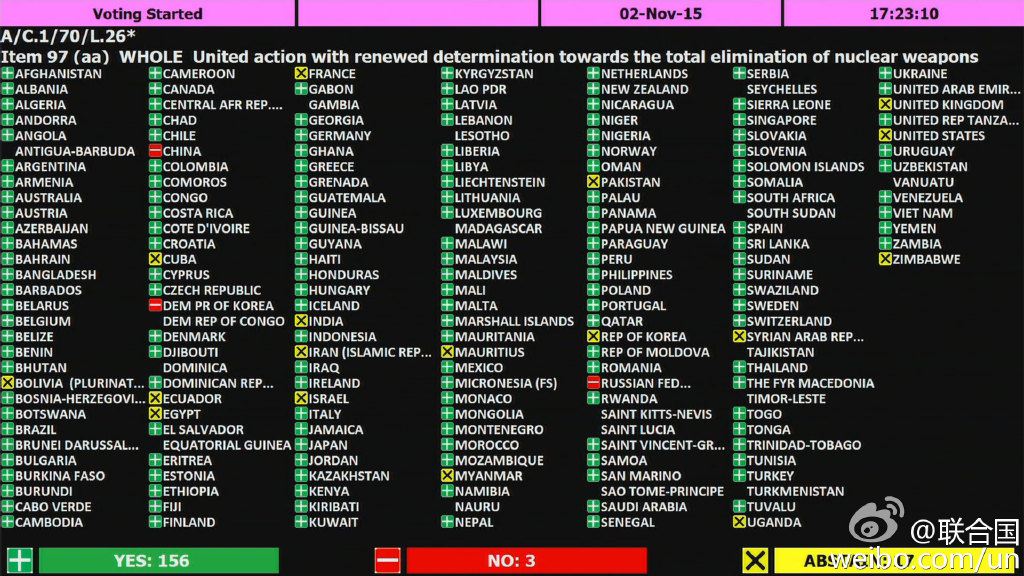 据联合国官方微博消息,北京时间11月3日早晨,联合国大会负责裁军与国际安全事务的第一委员会以156票赞成、3票反对和17票弃权的表决结果通过了题为“再次下决心采取联合行动彻底消除核武器”的决议草案。