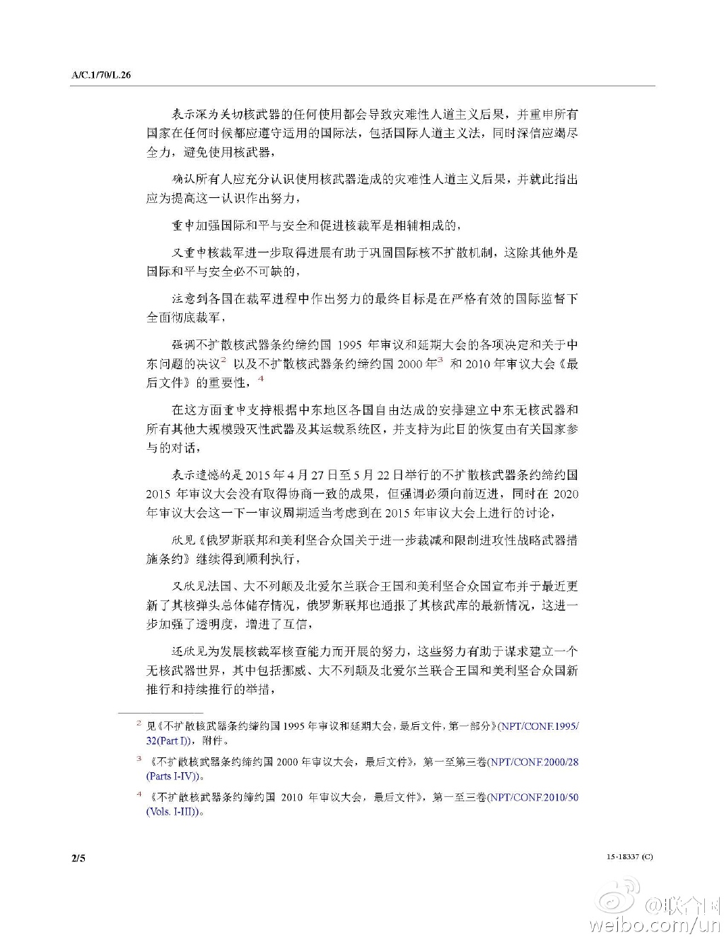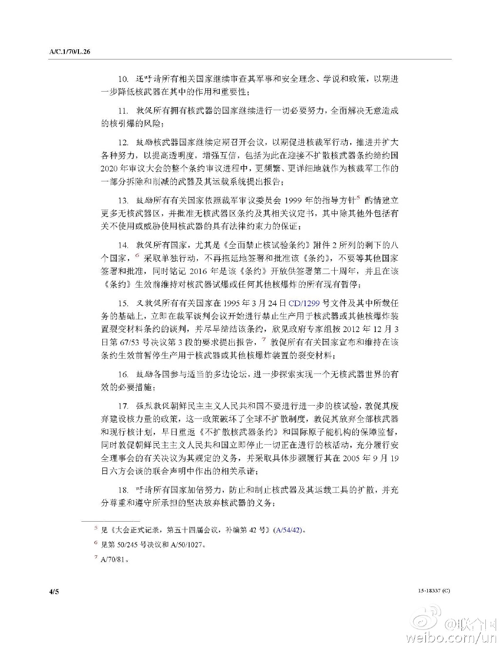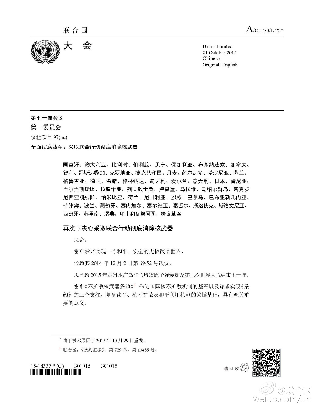 “再次下决心采取联合行动彻底消除核武器”草案如下: