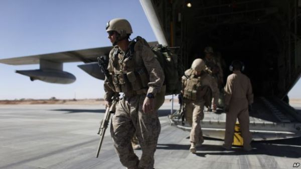 美国海军陆战队走下C-130运输机(图片来源:美国之音电台网站)