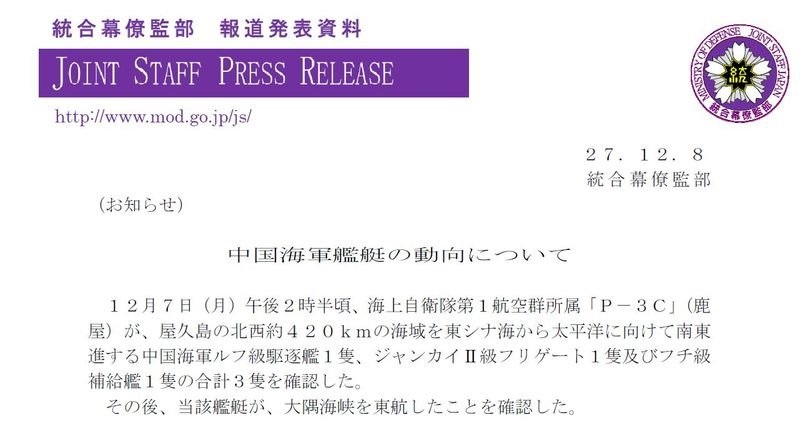 中评社香港12月8日电:日本统合幕僚监部今天表示,12月7日下午2点左右,海自第1航空群所属P-3C(鹿屋基地)确认,中国海军旅沪级驱逐舰一艘、江凯II级护卫舰一艘及福池级补给舰一艘,经屋久岛西北约420公里海域,从东海向东南航行,驶向太平洋。之后,确认该批舰艇经大隅海峡向东航行。