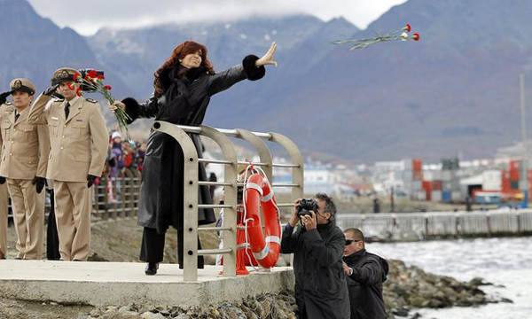 2012年,时任阿根廷总统克里斯蒂娜向比格尔海峡马岛方向抛出鲜花,纪念“马岛战争”30周年