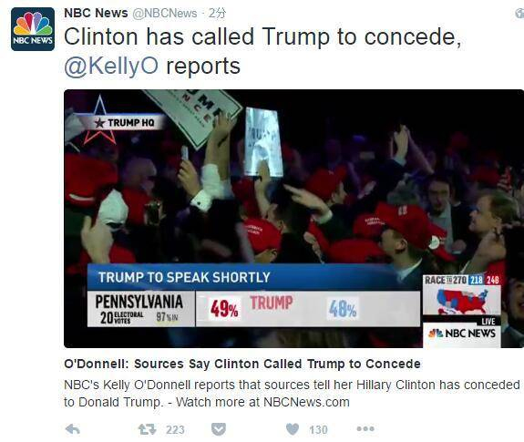 希拉里给特朗普打电话承认败选