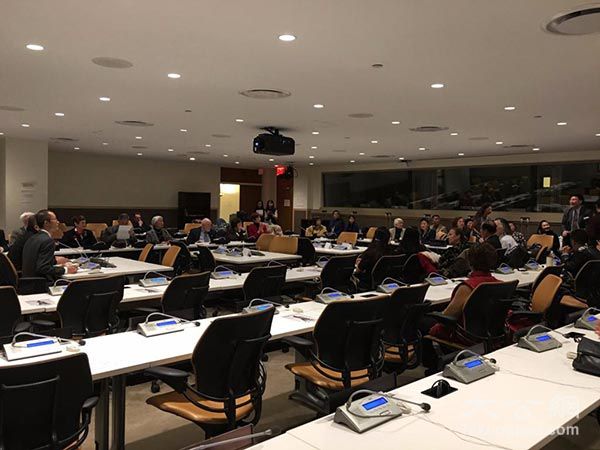 纪录电影《旋风九日》15日晚在纽约联合国总部举行放映研讨活动。图为活动现场。(黄晓敏摄)