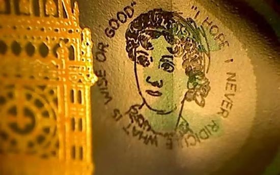 今年9月份英国推出新版5英镑钞票,因首次采用塑胶材质而受到民众热捧。著名微雕艺术家格雷厄姆.修特借机开展行为艺术,由于今年是英国已故作家、《傲慢与偏见》作者简奥斯汀去世二百周年,他选择在4张5镑新钞上以微雕形式刻上奥斯汀的头像,位置在大笨钟及英国前首相丘吉尔头像旁边,仅5毫米大,用肉眼不易发现,拿放大镜才可以看清楚。