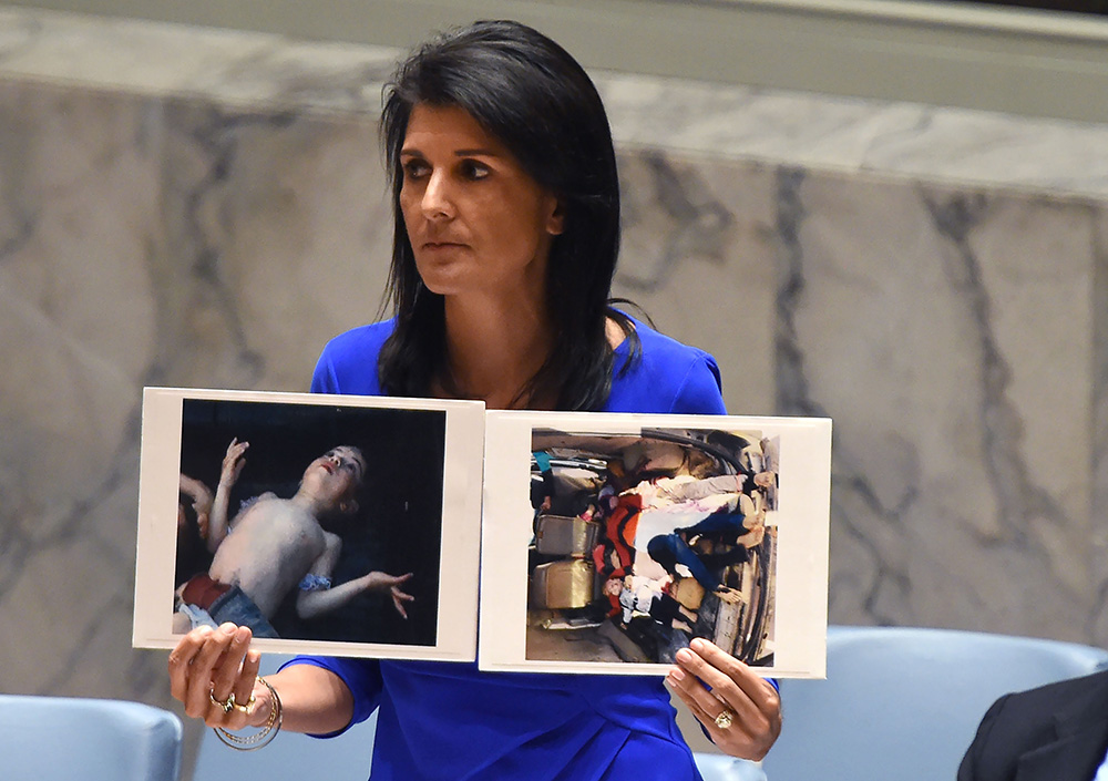 4月5日,美国常驻联合国代表黑莉在联合国会议上展示化武受害者照片\法新社