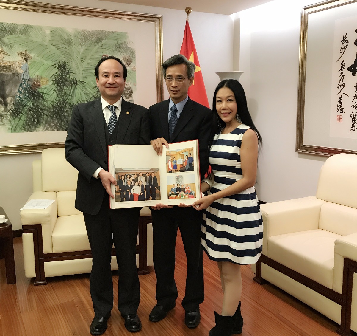 美国一带一路总商会会长和秘书长向中国驻南非特命全权大使林松添(中)大使赠送了习仲勋诞辰100周年纪念《习仲勋画册(英文版)》