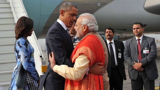 据BBC中文网报道,莫迪打破礼宾惯例亲自去德里机场迎接奥巴马一行。莫迪对奥巴马说,印度和美国正在开始合作的“新旅程”;奥巴马则表示,两国的新友谊将向更高端发展。两国领导人宣布了新的防务和贸易动议,并且致力于举行更经常性的双边会谈。